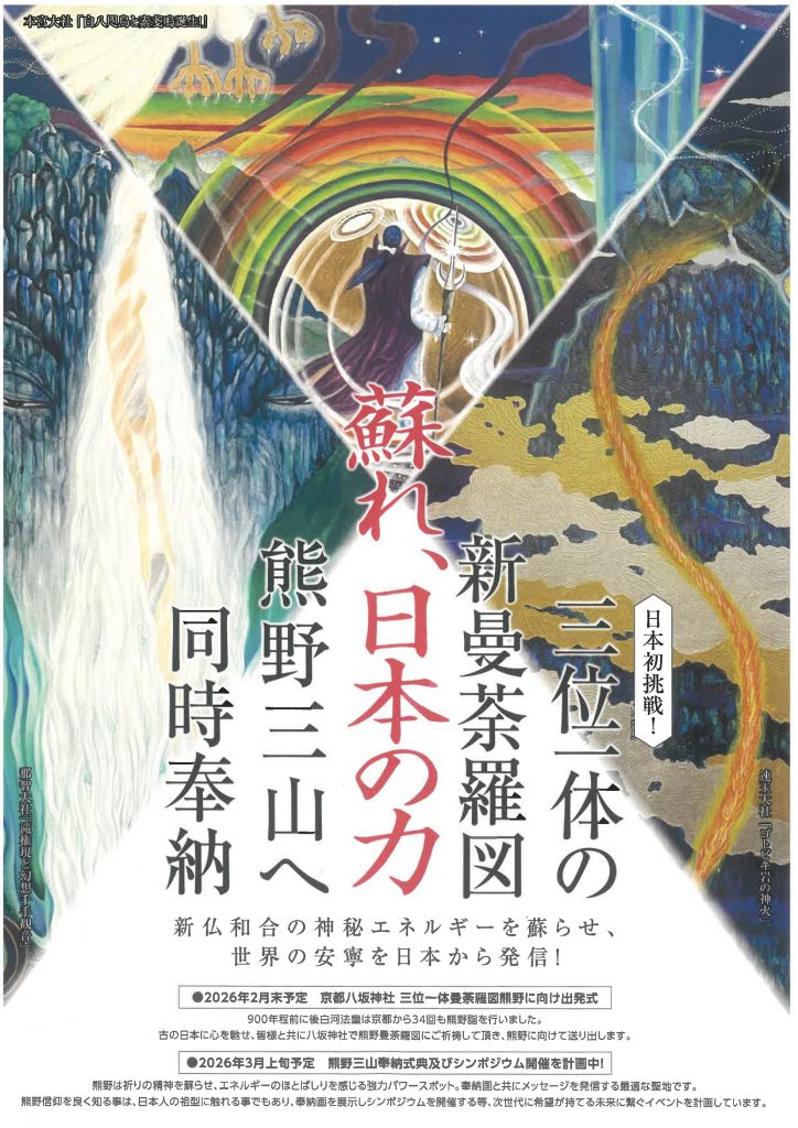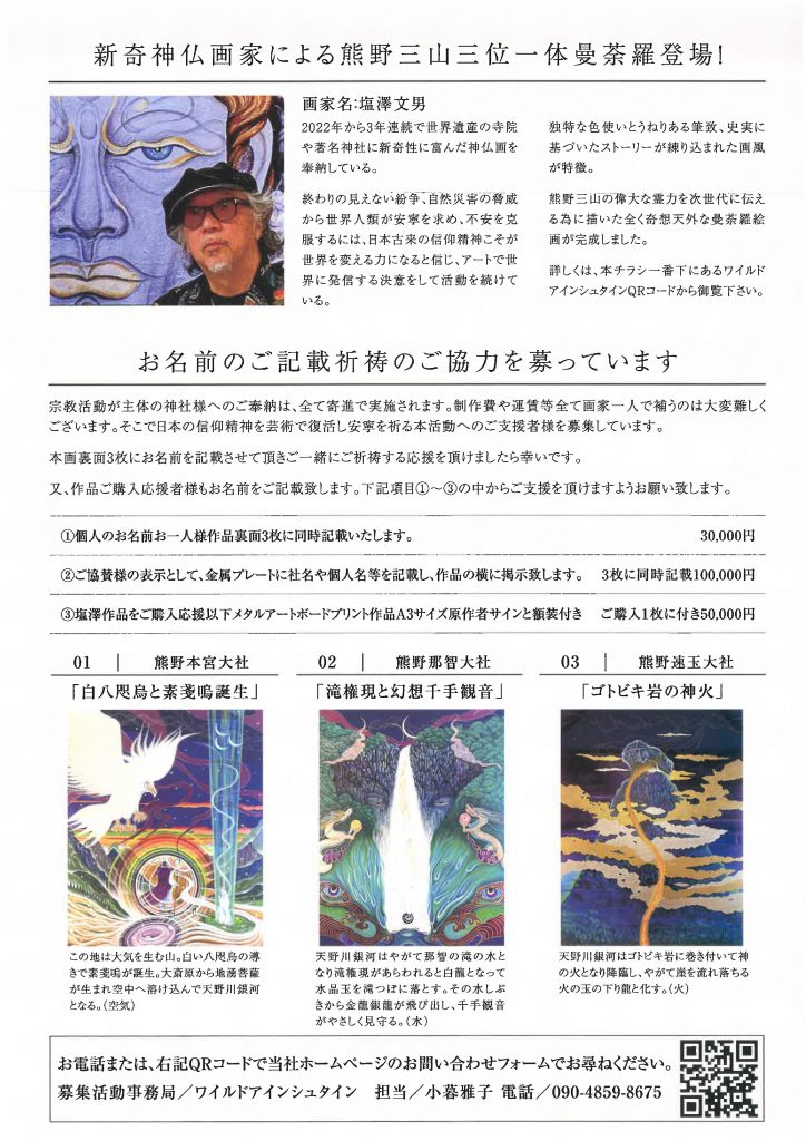 予定としては、2026年2月末に京都・八坂神社で出発式、2026年3月上旬に熊野三山で奉納式典/シンポジウムが計画中とのこと。作品の詳細はチラシ記載のQRコードからご覧いただけます。ぜひ皆さまも、塩澤先生の最新作をご覧ください。